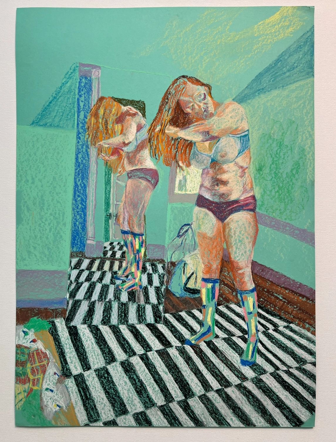 Woman getting dressed, 27x19 in., chalk pastel on colored paper, 2023